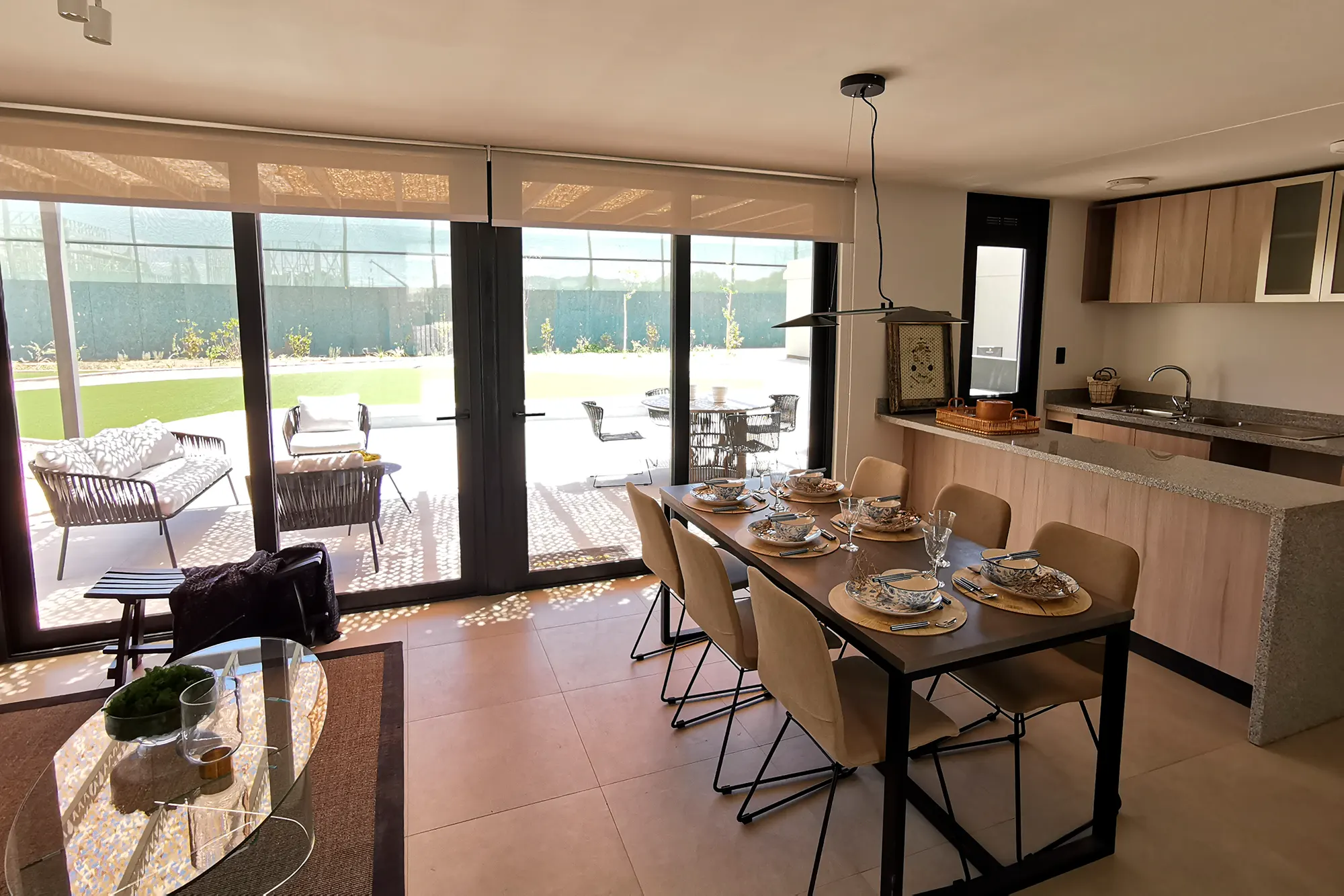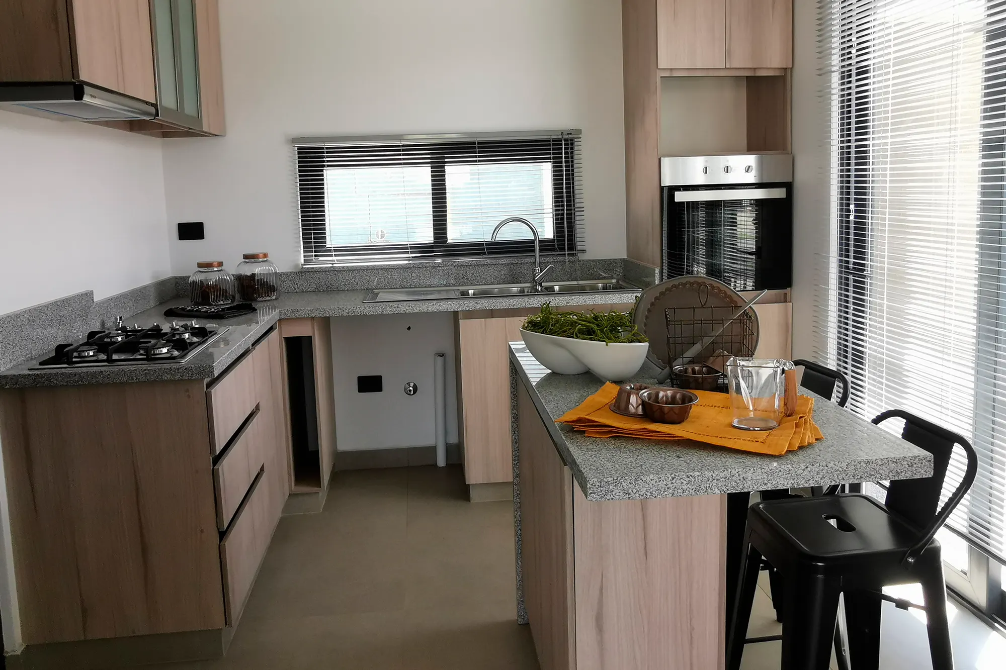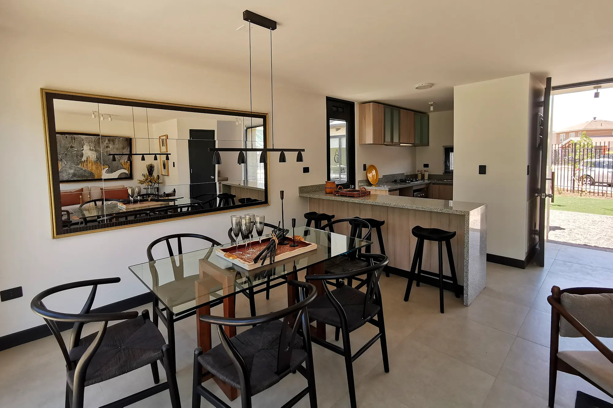 5 modelos de casas, mediterráneas y tradicionales, de 100,02 a 117,14 m2 con 3 dormitorios, 3 baños, sala de estar y logia techada. Ventanas de PVC termopanel. Cocinas en opción tradicional o integrada, amobladas con cubierta de granito y equipadas con cocina encimera, horno empotrado y campana. Opción de calefactores eléctricos en living comedor, dormitorio principal y sala de estar.