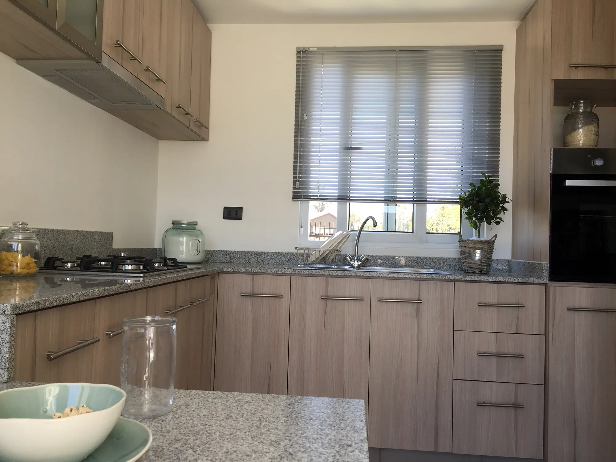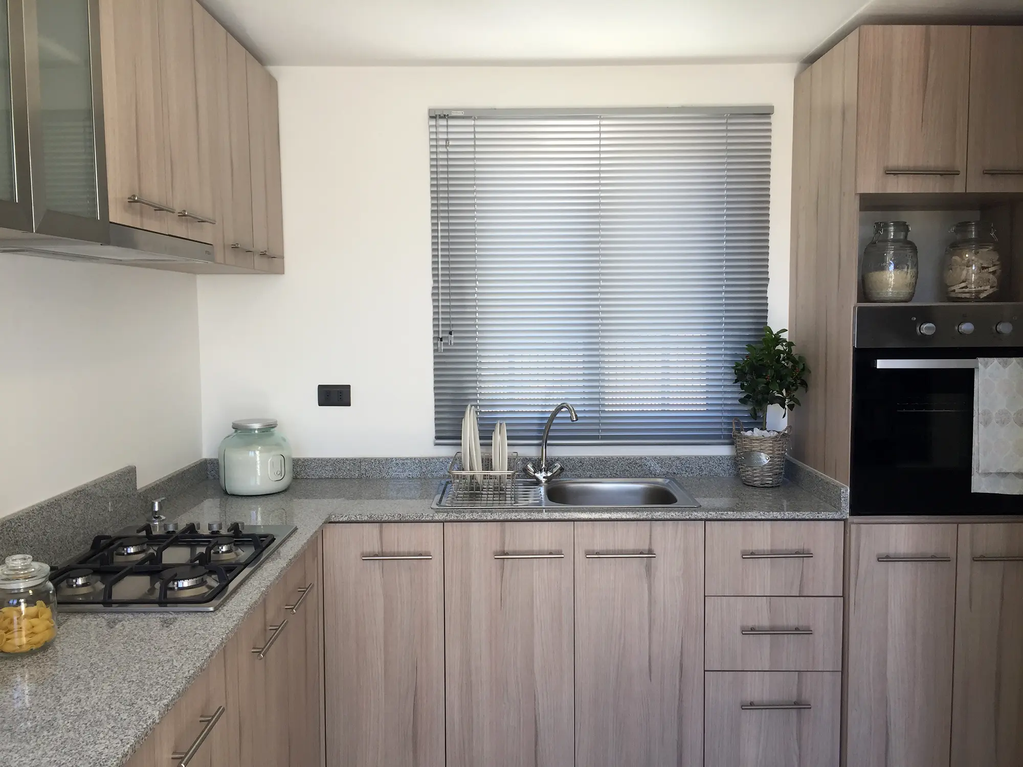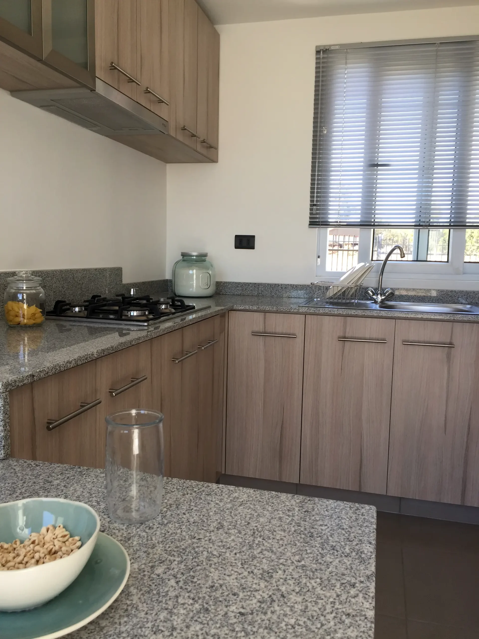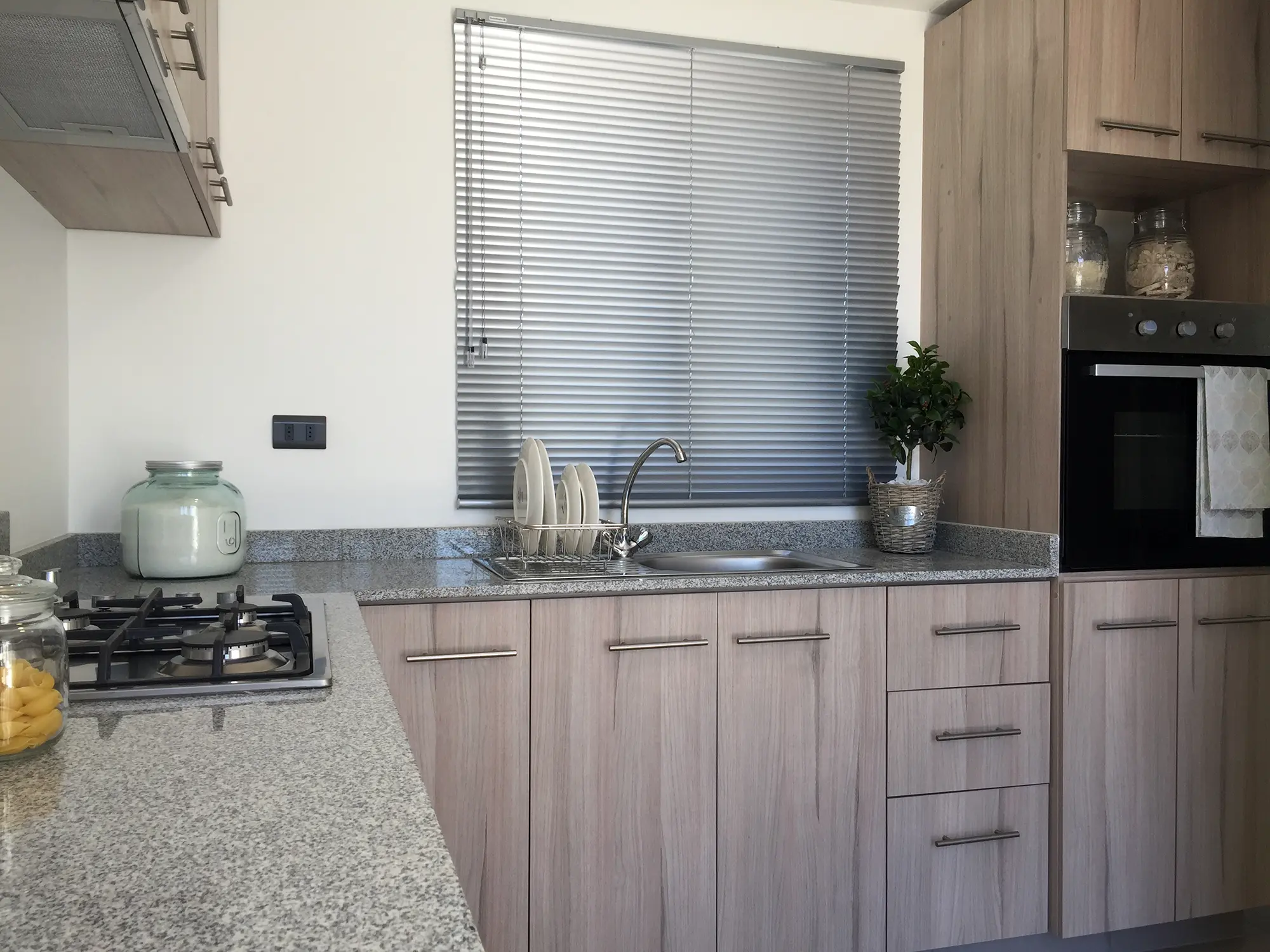 • Cocina amoblada con cubierta de granito, equipada con horno empotrado, cocina encimera y campana.